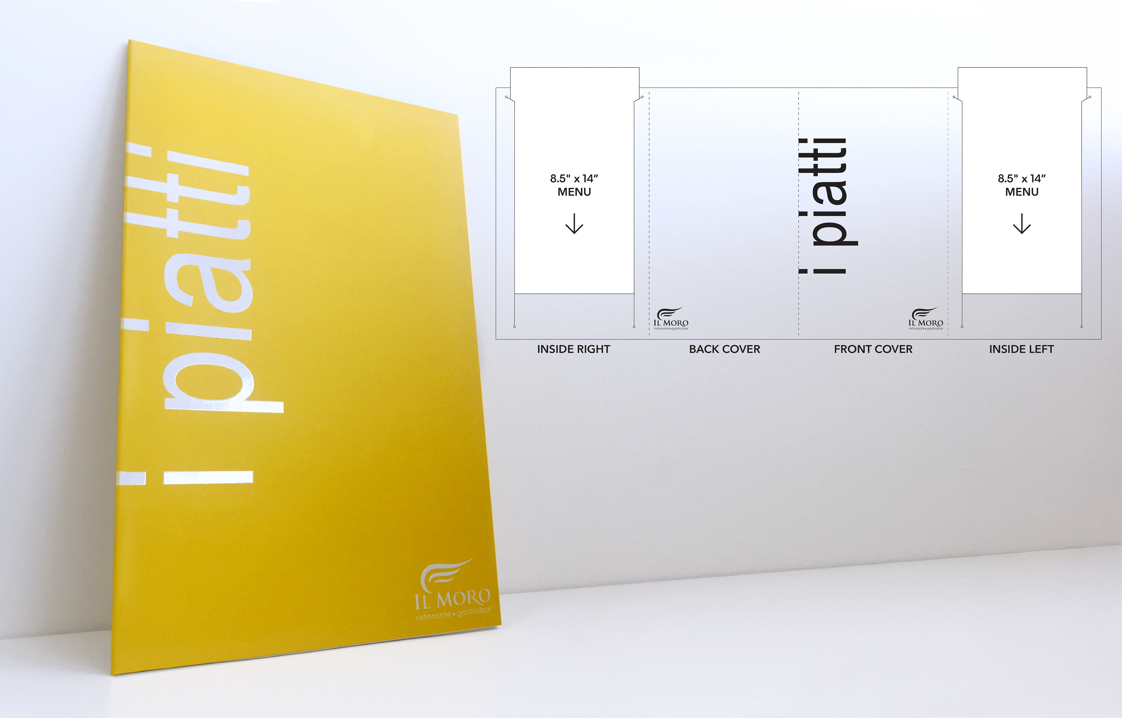Custom die-cut menu cover designed to hold two legal-size sheets for easy in-house printing — Il Moro Restaurant